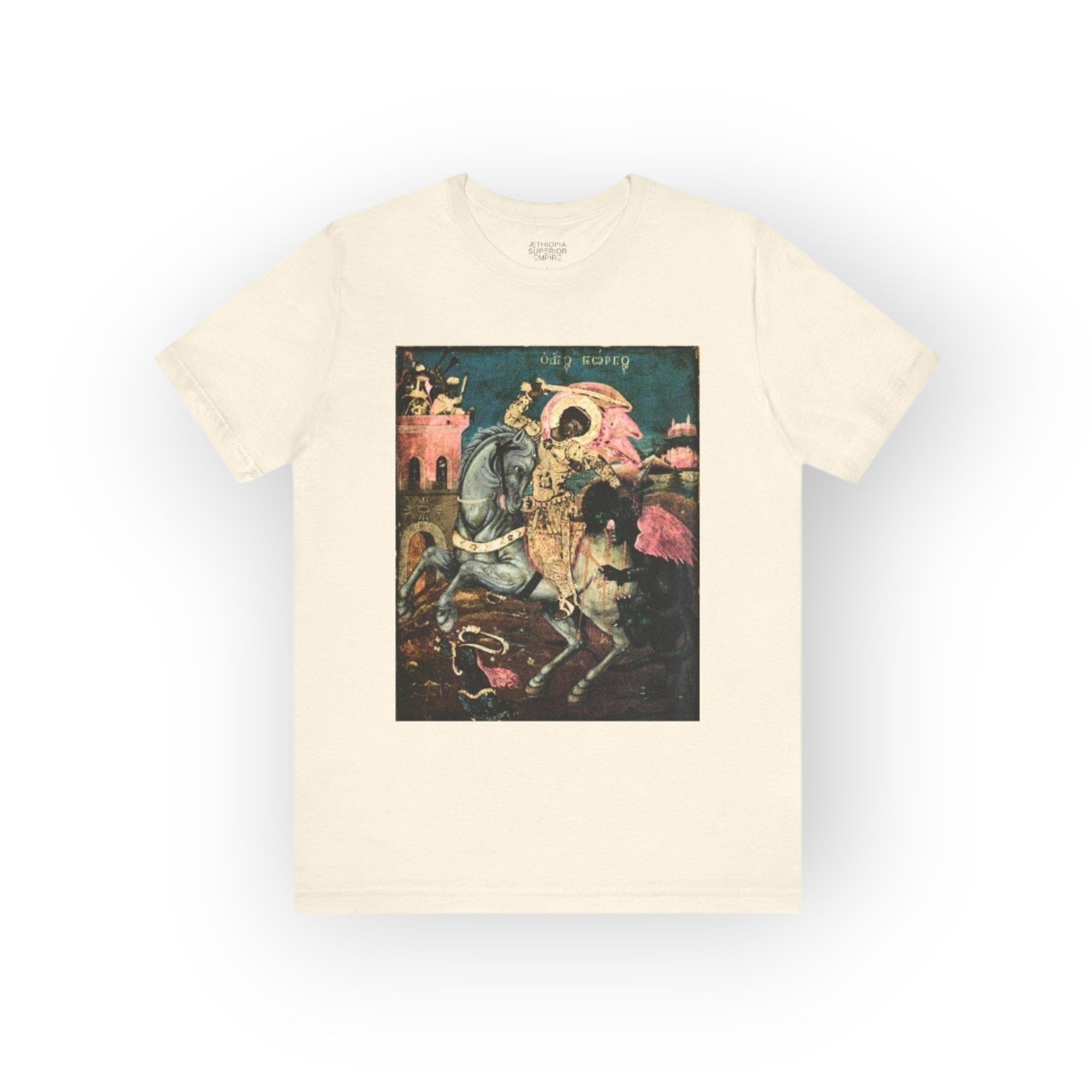 Wearable like a whispered story — this lightweight cotton tee carries a richly detailed medieval-inspired print across the chest. The image of a mounted knight moving through a twilight castle scene feels both antique and cinematic, lending quiet drama to everyday outfits. The soft, breathable fabric and clean crew neckline make it easy to layer under jackets or wear on its own. It’s made to move with you: structured side seams and shoulder tape keep the shape crisp, while a tear-away neck label keeps irritation away. Let the shirt be the low-key focal point of a casual evening, a museum visit, or a coffee-fueled afternoon of sketching and reading.